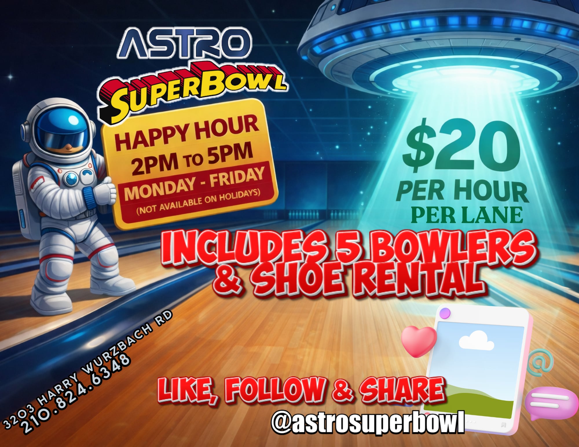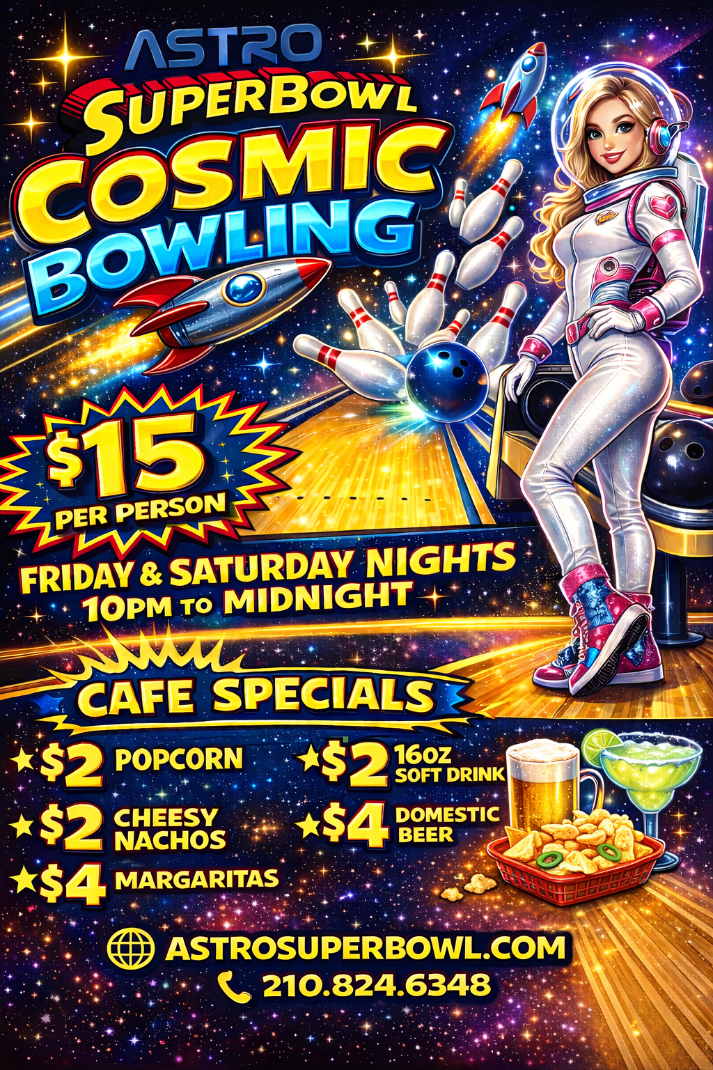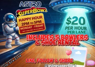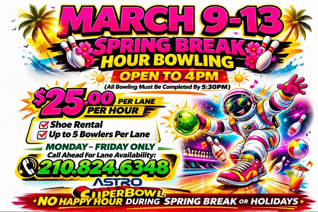 San Antonio’s Place to Bowl BOWLING ⋅ FOOD ⋅ DRINKS ⋅ PARTIES ⋅ AND MORE San Antonio's Premier Bowling Experience! With 44 lanes, a cafe serving the tastiest food, a full bar, and pro shop, we’ve got everything you need to have fun!